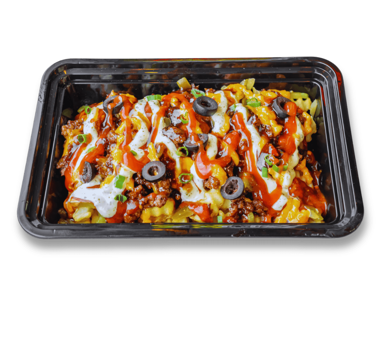 House Special fries topped with smashed beef, melted cheese, ketchup, crispy onions, house sauces, olives, gherkins & chives.
