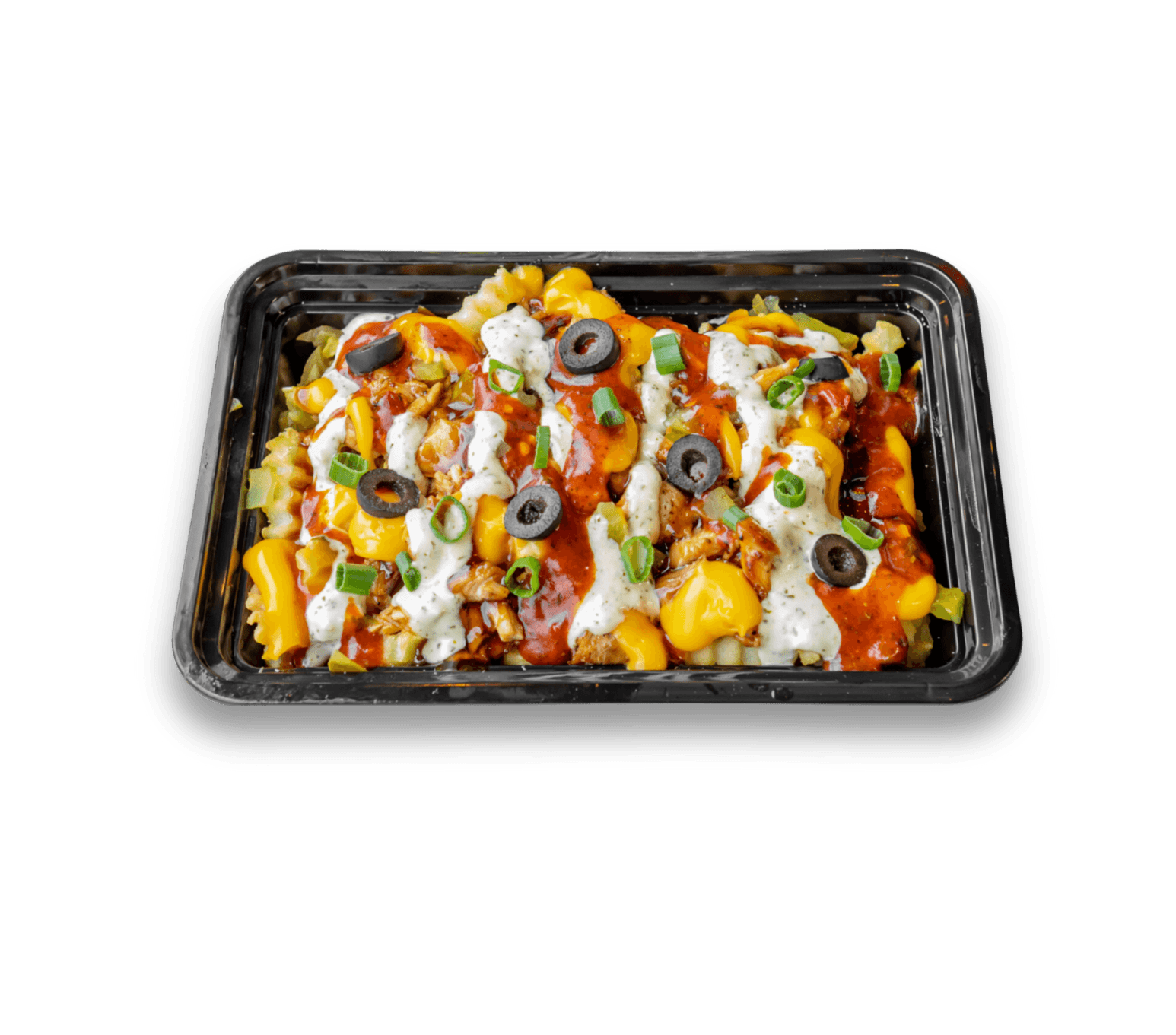 House Special fries topped with crispy or grilled chicken, melted cheese, ketchup, crispy onions, house sauces, olives, gherkins & chives.